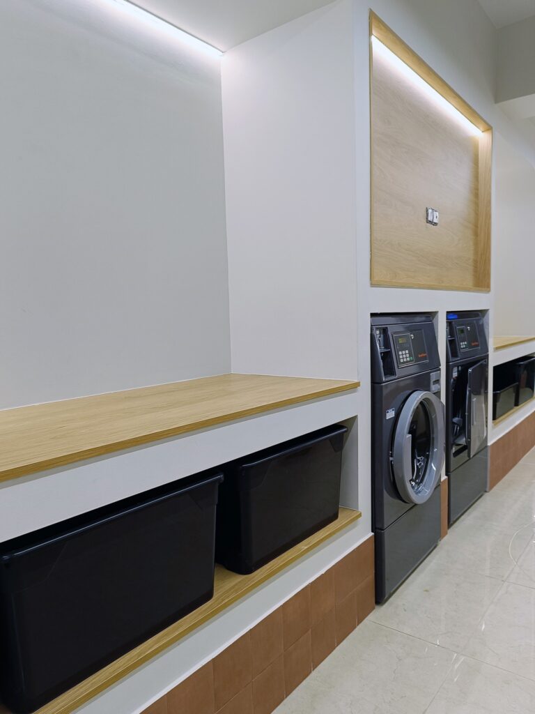 Στο πλυντήριο self-service της Wash It, θα βρείτε μεγάλα τραπέζια για να διπλώνετε τα ρούχα σας και αναπαυτικούς καναπέδες για μια άνετη αναμονή, μέχρι να τελειώσουν τα ρούχα σας. Δωρεάν Wi-Fi διαθέσιμο για τους πελάτες.